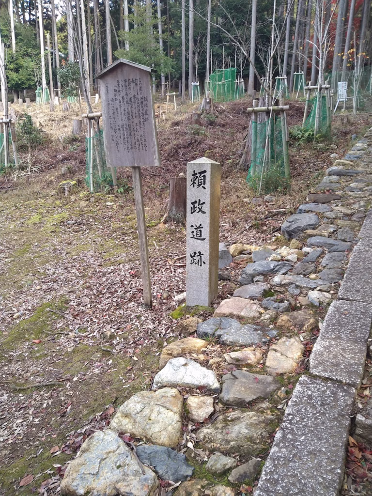 「源平盛衰記」に『醍醐路に懸かりて木幡の里を伝いつつ宇治へ』と記されている部分す。立て看板には(一言寺→日野ひげの辻→木幡→宇治)と書かれているのでちょうどここを通り過ぎた感じでしょうか。一言寺、法界寺を通り宇治に抜けた山道が頼政道です。