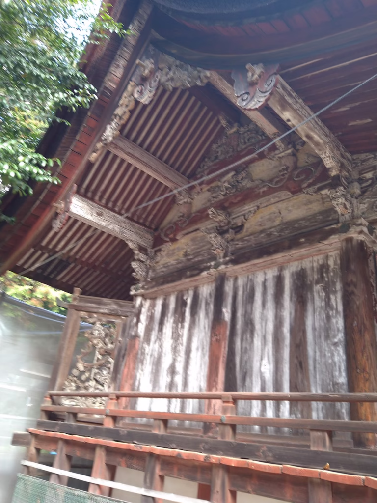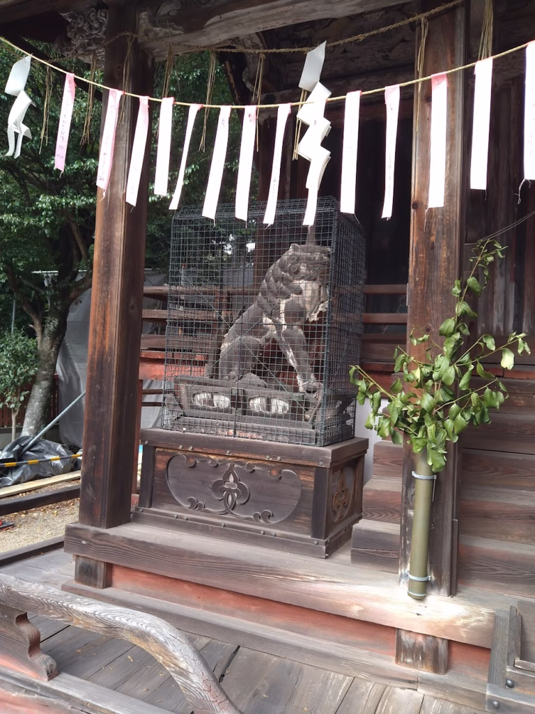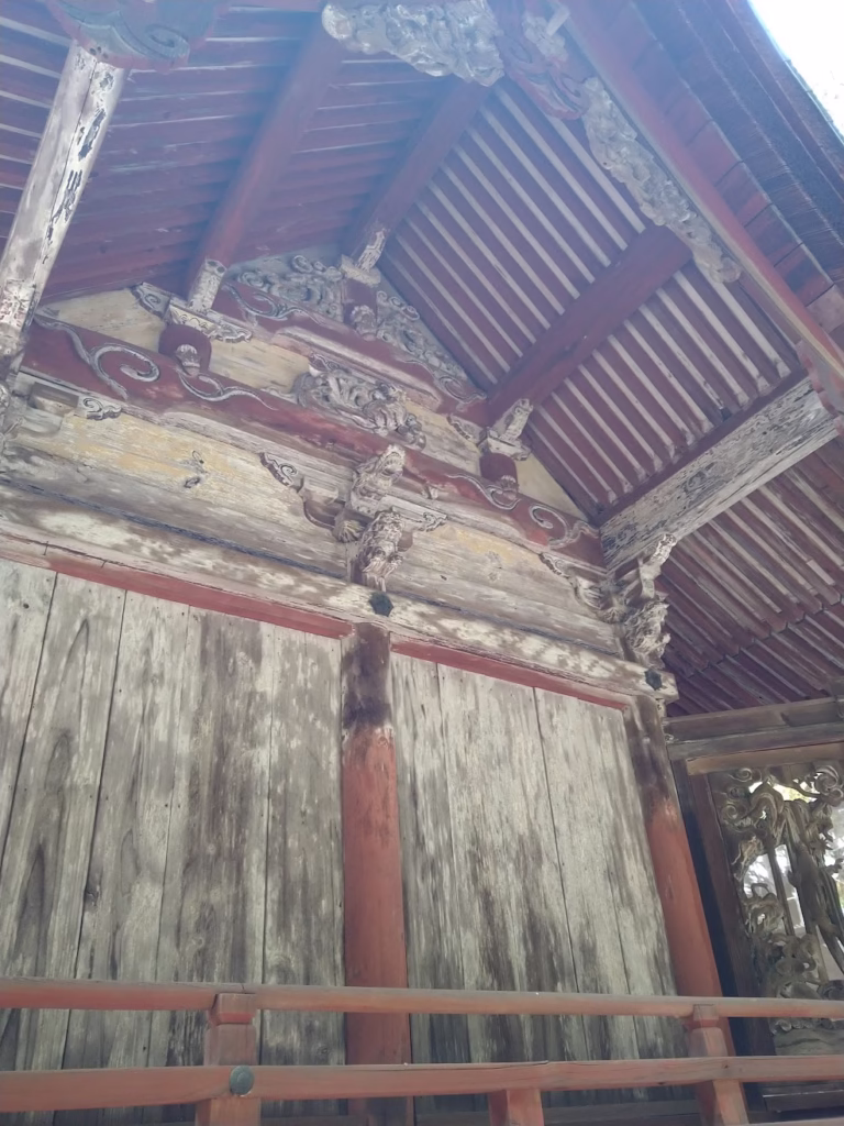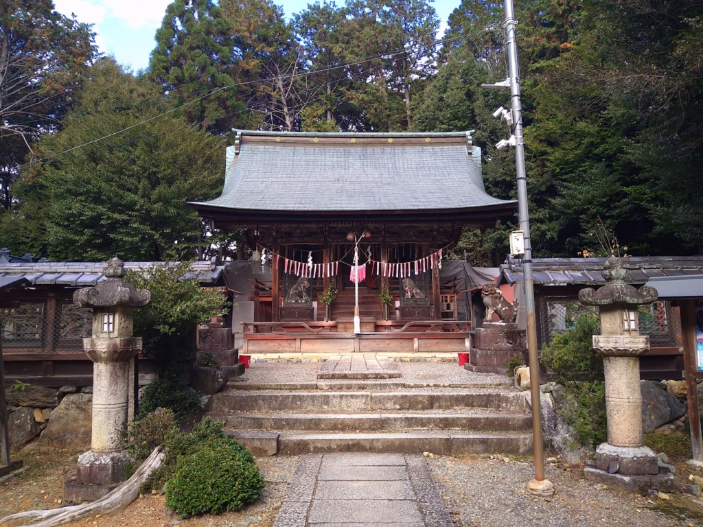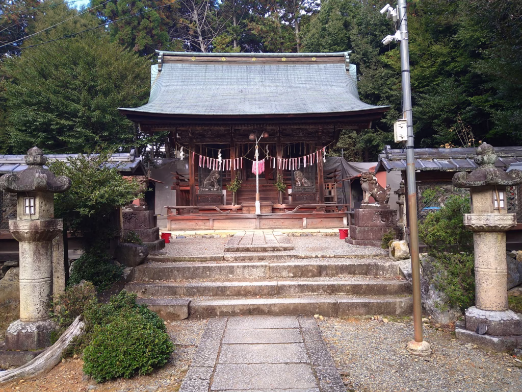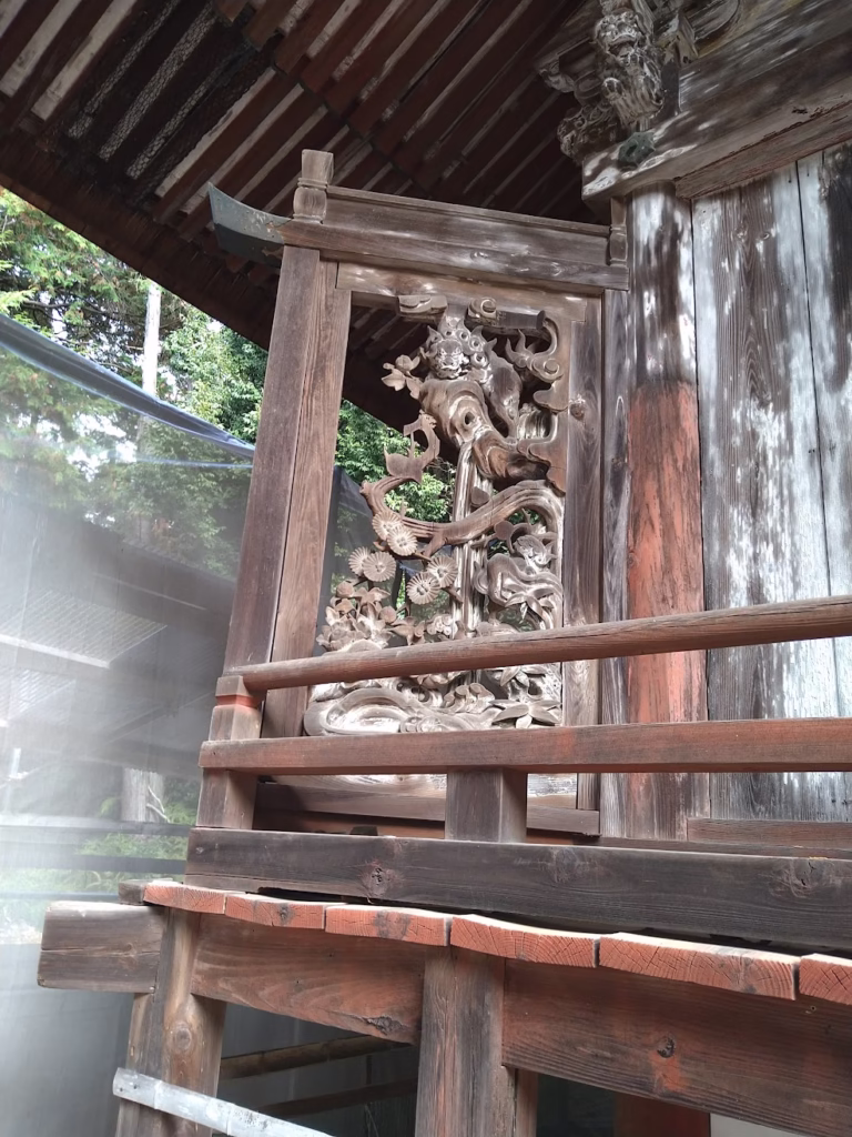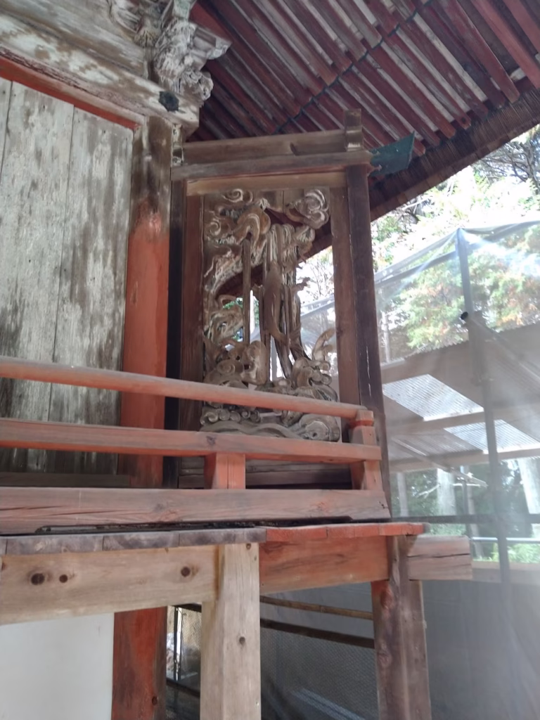 本殿は、三間一面皮茸の建物で柱や梁には胡粉下地の上に岩絵の具で彩色を施し、極彩色の文様が描かれ、脇障子には、鯉の滝登りや獅子の子育てを題材とした透かし彫りの幕板がはめ込まれるなど、市内有数の装飾に富んだ造作が見られます。