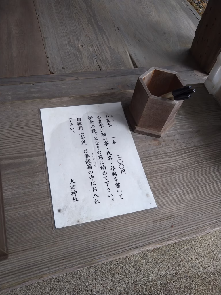 願い事の小真木もありました。無人なので100円玉は必須ですね。