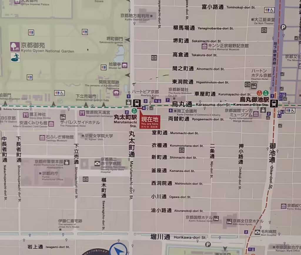 京都駅からだと京都市営地下鉄に乗り換えて烏丸線で丸太町駅