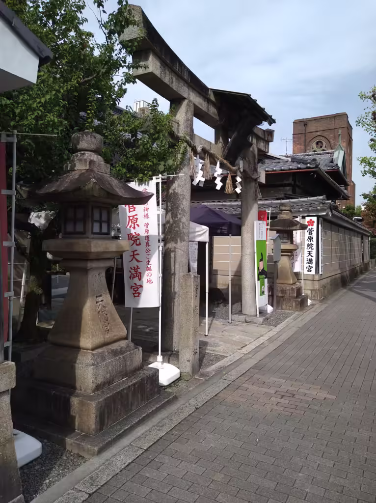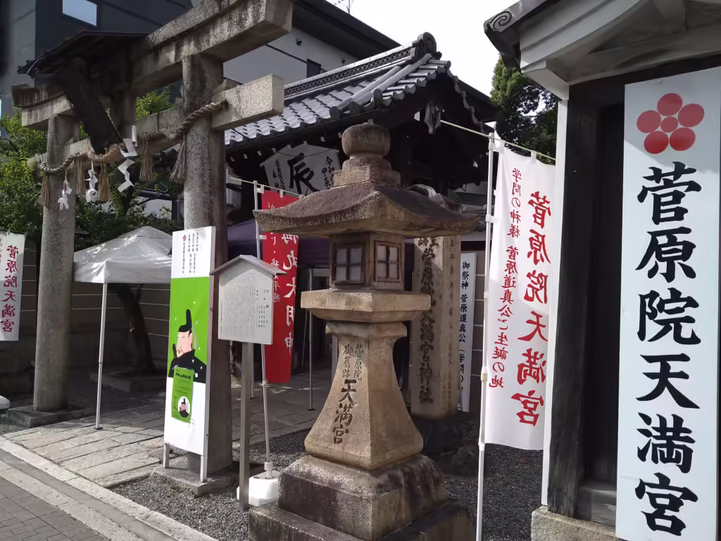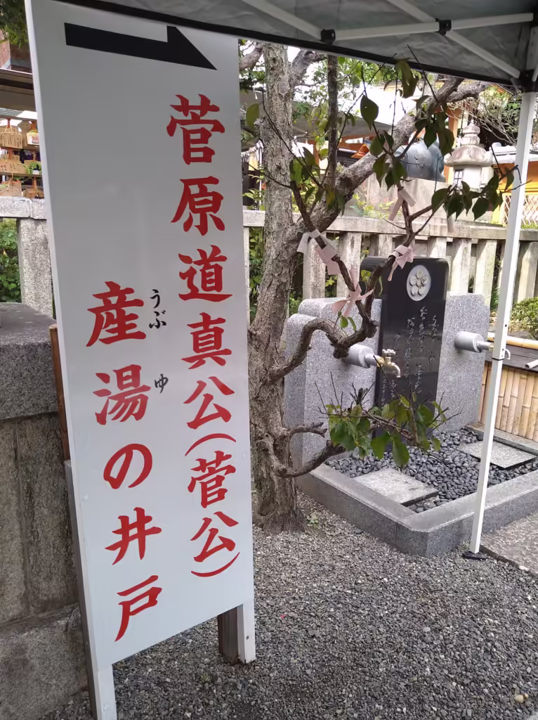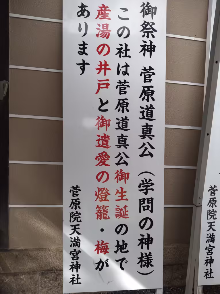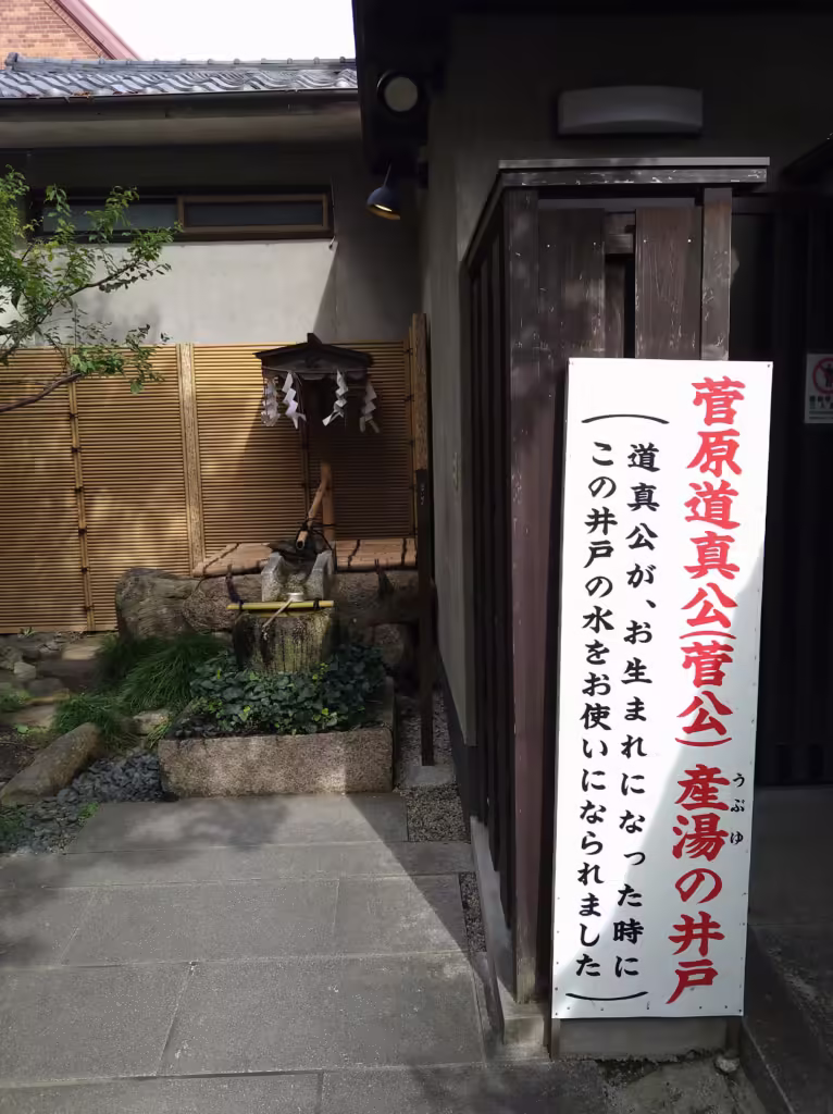 境内にはガン封じの石や、道真公の産湯井戸があり小さな敷地の神社ながら多くの参拝者が訪れます。また菅公聖蹟二十五拝の第1番札所としても知られています。