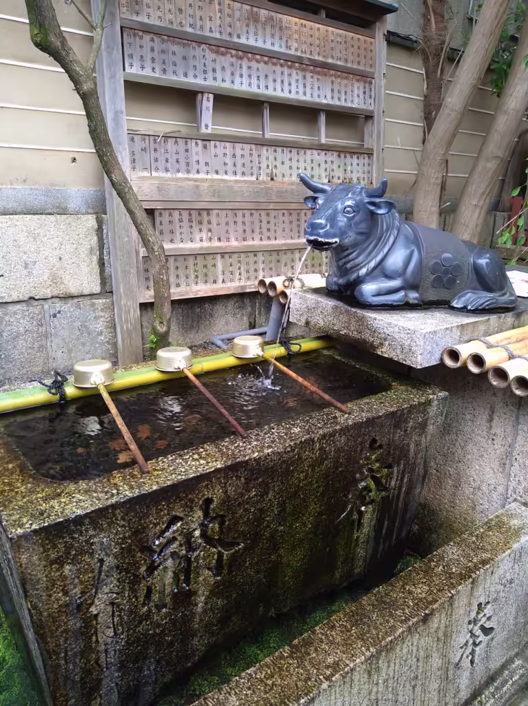 手水舎は入り口から入ってすぐにあります。菅原道真公だけに牛から水が出てます。